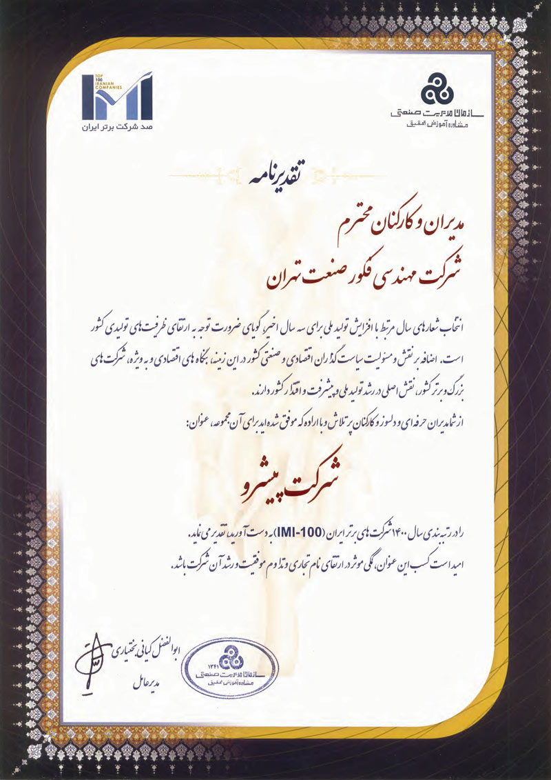 محمد وحید شیخ زاده مدیرعامل شرکت مهندسی فکور صنعت تهران گفت: فکور صنعت تنها شرکت پیمانکاری است که جز صد شرکت برتر درمیان بانکها، پتروشیمیها و فولادیها و دیگر شرکتهای تولیدی قرار گرفته است که روحیه جمعی، نوآوری و سرمایههای انسانی در این شرکت باعث شده برند بسیار خوبی از فکور صنعت در کشور ایجاد شود.